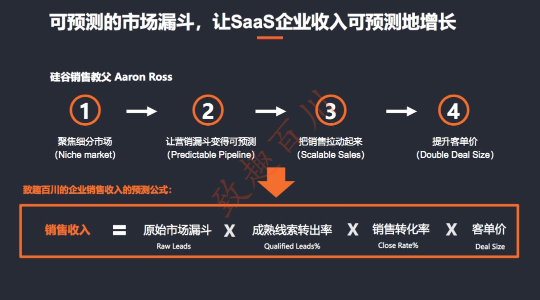 本文整理自“2018中国企业互联网CEO峰会”志趣百川联合创始人&COO逄大嵬的演讲,内容略有删减。 志趣百川联合创始人&COO逄大嵬 今天每个企业最想要的是什么?第一是增长,第二是可预测性增长,可预测性增长背后第一位是每个企业要构建自己可预测的市场漏斗,这一点非常关键。 根据硅谷销售教父的观点,我们总结为销售收入的公式,销售收入=原始市场漏斗*成熟线索转出率*销售转化率*客单价。 但是都想要增长,都想要漏斗,从哪里来?我们要找到每一个客户和潜在的商机。 这是我们从2013年到2018年看到的一组数据,大家清楚的感觉到,从2013年、2015年开始每一个百度投入成本在100%、200%的上涨,每一次的电话流通成本都非常的快的上涨,所以是什么?是我们每一次客户的获取成本上涨了,今天获取低成本客户很难。 一个新的理论——“鱼池养鱼论”,如果将客户比作鱼,B2B企业要构建自身客户池,即鱼池。通过内容营销制作鱼饵,并埋好鱼钩钓鱼;撒网钓鱼,把大量客户线索从各个鱼塘中汇集起来并不断养大,要做多渠道的打通、兼容和汇总;捕鱼收网,通过标签体系明确用户画像,知道钓的是什么鱼,通过线索打分,知道鱼的斤两成熟度;饲养、育苗,针对在不同阶段的用户采取不同沟通策略,通过营销自动化内容精准触达。
