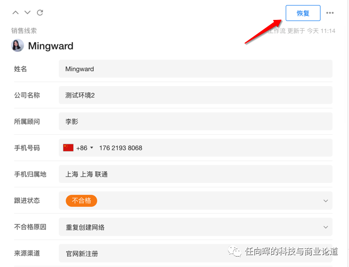 比如,在 CRM 应用中要给失效销售线索加一个“恢复”的动作按钮,明道云是这样做的: