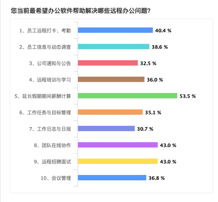 2号人事部与三茅人力资源网在本周联合发起的一项调研显示,管理者最希望解决的各种远程办公问题远远不止电话会议,而每一项被选率都在30%以上,这个市场,正在迎来各个垂直领域的急剧爆发。