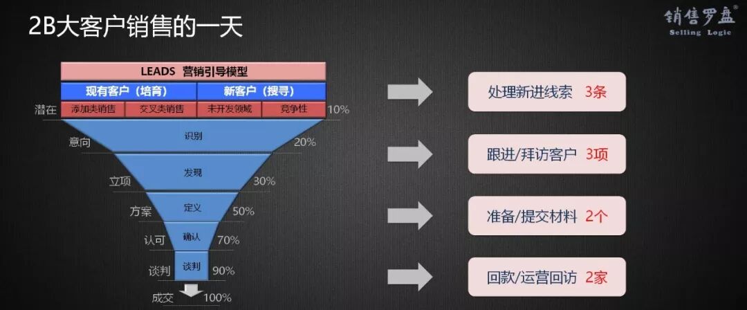 本文根据夏凯于崔牛会2018中国企业互联网春季峰会SaaS销售公开课上的分享整理而成(接上篇),扫描文末二维码获得课程视频 第一种就是在线式,包括给我们讲的集客营销、营销自动化、内部营销线索征集,然后外呼团队加线索处理团队,线索处理完,线上销售直接去成交,做demo,做演示,个别的去一下现场。基本上就是单次的,回来就要签掉,这种项目不要做大,不要做的时间太长,不要恋战。完了之后客户成功,包括你的实施服务,然后你的成功,你的运营再跟上再去找他,这是典型的在线成交模式。 在这个组织这么搭就OK了,蓝图在这一块做得非常极致,这个我觉得还是挺好的。我们的电话销售团队也可能按这个方式来走,只不过我要做的事情我会把接线索的三句话写出来。 大家如果看过我们的视频,你就知道说什么。客户问:“请问这里是崔牛会吗?”你怎么接?“是的。”下一句呢?没有。“请问你是崔牛会吗?”应该怎么答?“是的,这里是崔牛会。”共鸣!第二句回答我是谁,我是崔牛会负责生态合作的,那你看有什么帮你?这时候不要问你是谁,你有什么需求,你想干嘛,那个问题都太深了,就轻轻的层层递进,所以我们要把话术,还有这种线上销售话术,我们会整理的特别精细到位,它是有方法论的,这是我们要做的。所以你有好的模式,没有好的方法论,你的线索成交率还会低。 第二个是地面销售模式,以前阿里中供铁军里面也写过,我有几个阿里的朋友,我也向他们请教过,他们到区域级,对于一个区域的线索的分析,区域经理一般五到七个人,每天早会、晚会、复盘会,你每天的线索准备度,回来之后的总结会,然后OK了之后,你的量统计上来。销管就是以前放大的区的政委,小的就是销管,管理线索,管理士气,管理整个团队内部的一些事务。这个做完之后,它会收到后台运营里,后台运营就去抓了。 当年我们也做地推,做完之后卖个软件包就没了。以前做软件包的时候,卖一套财务没了,卖个帐表没了,卖的供应链说进销存回来没了,只能收点服务费,15%到20%,剩下的只能是交叉销售,二次闭环销售,它就没有这种持续付费,我们当时做地推,我觉得也费了劲了,也没有达到最佳效果。 第三层模式是战略客户经营模式,或者说解决方案经营模式。在客户行业区域会出来一些重要客户,那这里边会有总监。销售金三角是什么?策略、技巧、方案。方案含行业和产品的应用场景;沟通技巧,人际技巧在这儿;策略是你的大单的攻防策略,十个决策你怎么摆正?攻哪守哪,是在这,这是销售金三角。 如果把销售的职能和客户合并起来,这叫什么?这叫铁三角,就是华为的铁三角,就像打仗的时候,三个兄弟背靠背,大家循环着转着圈的往前走。今天方案经理对着他,再转一圈交付经理对着他,再转一圈客户经理对着他。大家转着圈的往前走,然后联合起来。 那好,接下来我们开始进入主题。其实我们所有做销管的同事都有概念,线索量、线索转化率、商机赢率、每单单产、回款比……每单单产和回款比这两个在2B销售里面是非常重要的东西。 你做SaaS和工具,你的单产是一定的,回款是百分百,所以它不考虑这个。但如果你是解决方案,客户这个就非常明白,它要影响你的整个客户价值周期,所以回款业绩续费率。那首先刚才那个1000条转化率15%,如果你的赢率10%要用五天的周期,你的收入是这样。 假如你有一个这个业务,你从哪去优化它?线索转化率和赢率。你会发现这个是最关键的,增加更多的线索,提高转化率。后面你都百分百了,你还怎么改?你总不能让他说,你给我交三年的钱才行,你这个已经没有改进空间了。所以现在的问题就是我说的那个兴趣处理,电话销售的成功率就在那了。话术、行为、心理研究整个的设计。 那我们再来看一个,比如说500条,线索30,赢率20,单产10万,回款比80%,续费率60%,你觉得从哪改进?销售周期30天,能不能搞到20天?赢率20%能不能搞到40%?是不是这概念?各位,怎么改周期怎么改赢率?这是我们所做的落地的地方,我们回答这个问题,我怎么改善这个指标?我们不是说我找到这里,我要改,我不找这个答案,我要找到是我怎么能把它改善出来,我后面会谈这个问题。 我们再来看一个100条线索,50%的转化,30%的赢率,三个月的销售周期,单产80万,回款率70%,续费率20%,你怎么改?续费率,各位你这20%仅仅是80万里边的跟软件和许可相关的部分,有可能吗?所以这个续费率是不是那么好改?你发现这个项目什么模式了,从哪?你的赢率和周期90天能不能改成60天?你看没戏的就别去了。冷了的线索丢出去,不要僵尸项目在漏斗里趴着,对吧? 你要把漏斗刷干净点,别急存那种存货,每次一开会拿出来就说这项目有戏,关系好,一到成交的时候,领导又出国了,不都是这种故事吗?所以你把那种项目拎出来,咱吊打一遍,成就成,不行你拎出去扔了。可能就是这种,或者换个人给了。我们改变的是周期、赢率和单产。单产靠什么?靠解决方案销售,投资回报,卖的不是产品,是客户价值的这种回报率。有专门的方法要算,客户花100万才能挣多少钱,那是有算法的。 在这种情况下,其实你每个地方改变5%,人员不增加的情况下,绩效提升41%,这个逻辑是对的,但是三种销售模式不可能都提出来。有可能在一定时间之内,某几个值率先优化,然后再过一段时间,再去优化另外的值。好,什么时间优化什么值,你看就要用数据分析。这个公式OK吗各位?